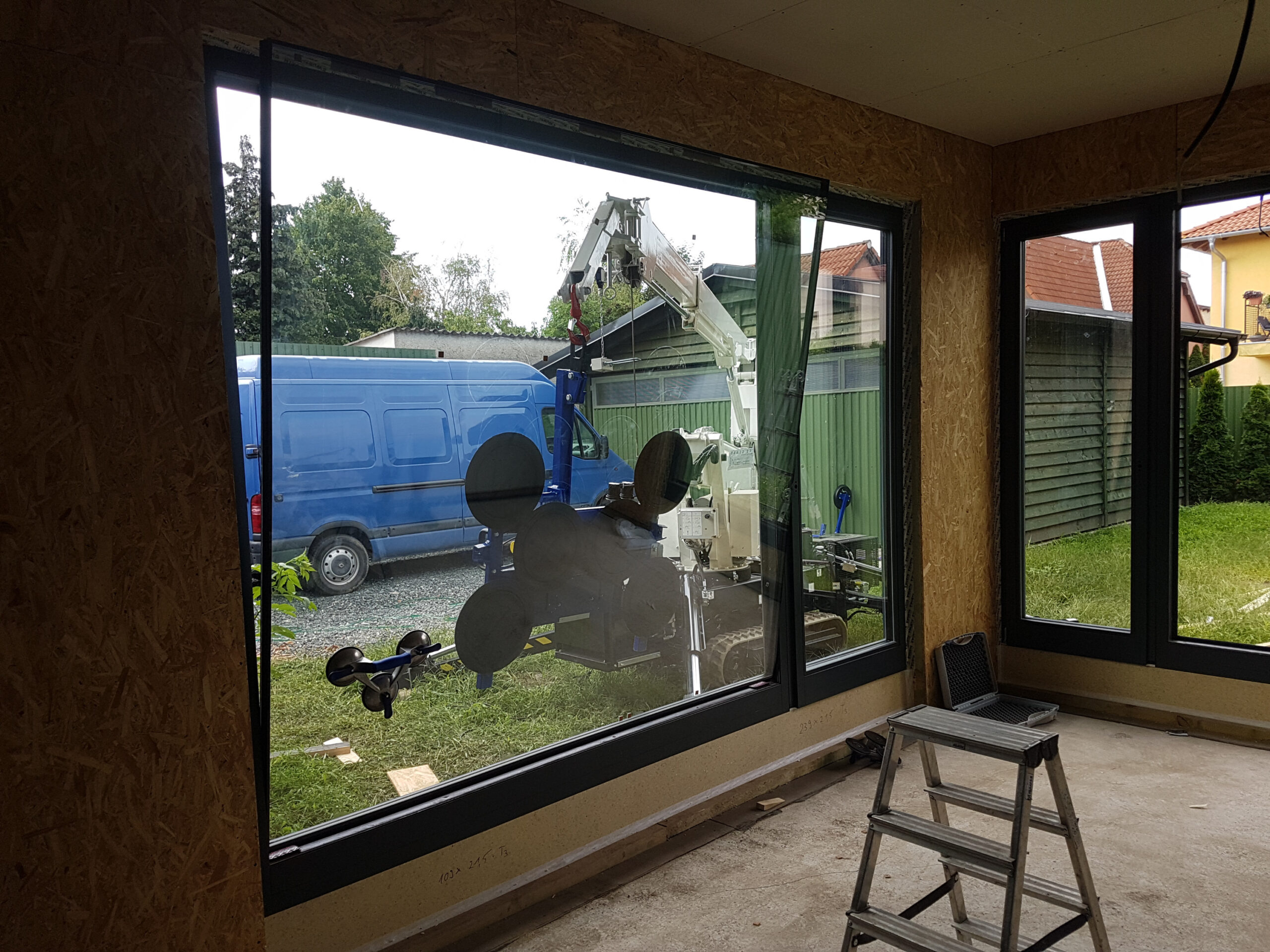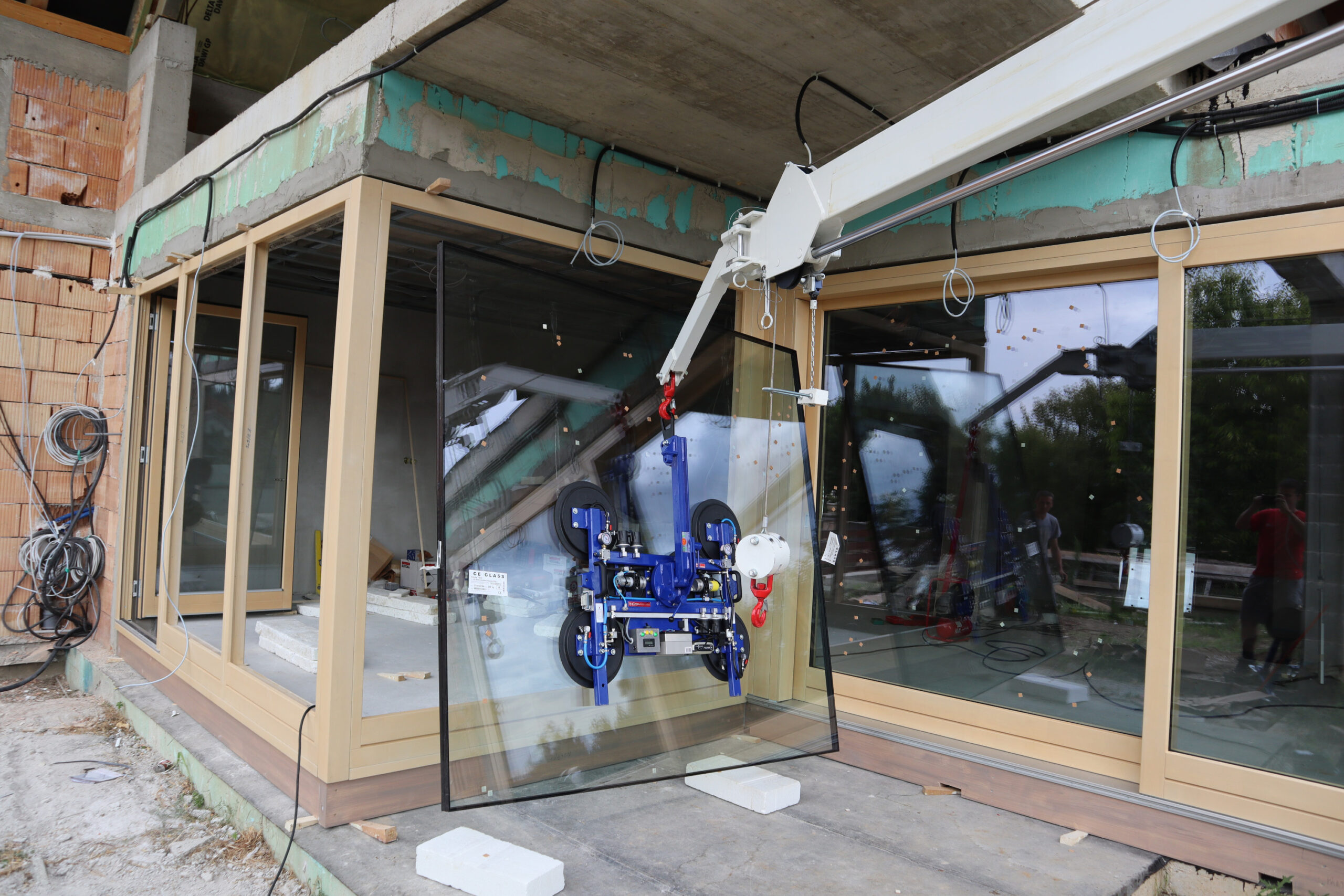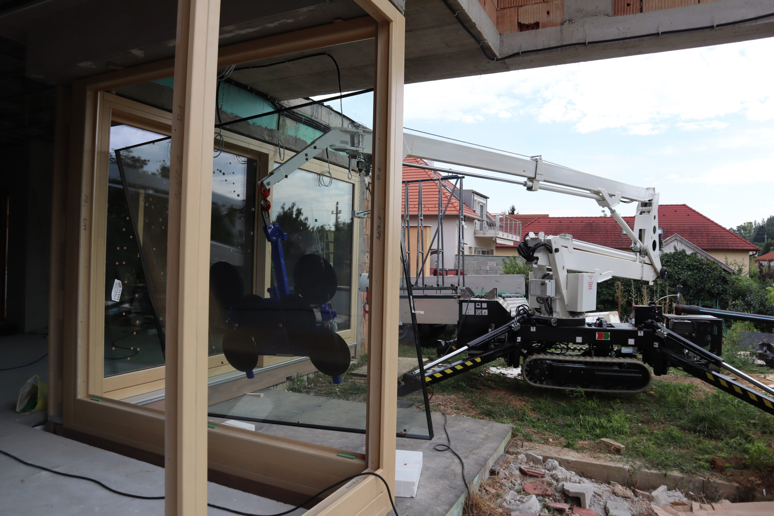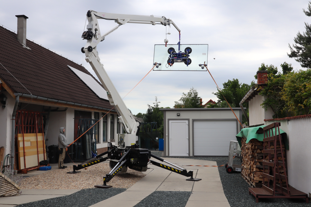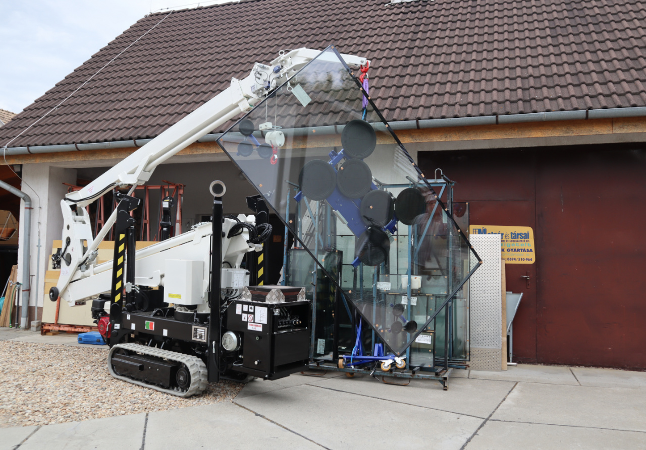 Nagy méretű üvegtáblák biztonságos és precíz daruzással történő emelése, elhelyezése magasban is.